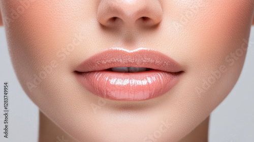 Fototapeta premium Beauty portrait close-up of glossy lips studio setting fashion photography soft lighting aesthetic appeal