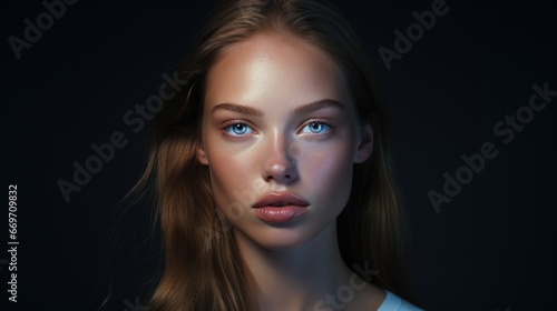 © Restyler, Fototapeta premium Beauty portrait of a beautiful young woman on a dark background. Feminine beauty. Radiant skin.