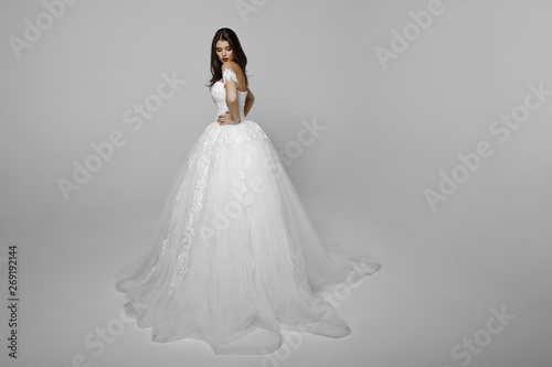 © Dragosh, Fototapeta premium Beauty portrait of a young woman in long white princess wendding dress with embroidery, luxury make up, poses standing a side, looking down, isolaetd on white background.