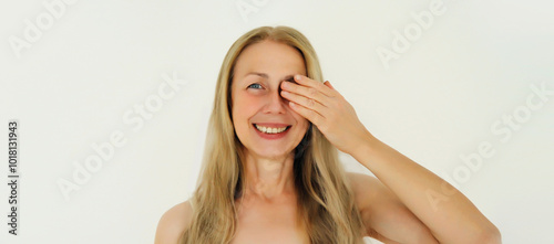 Naklejka premium Beauty portrait of happy smiling mature woman covering her eye on white background