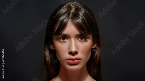 Fototapeta premium Beauty portrait of young brunette woman with brown eyes and colorful makeup looking at camera, posing isolated over black background