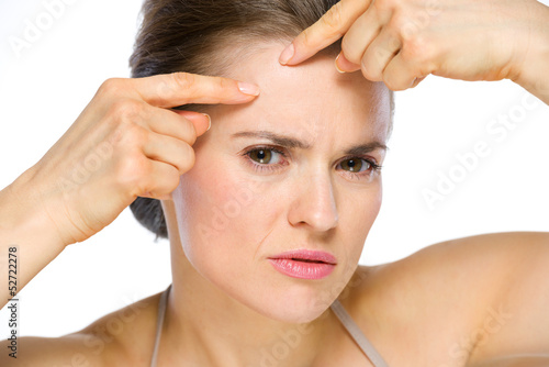 Fototapeta premium Beauty portrait of young woman squeezing acne