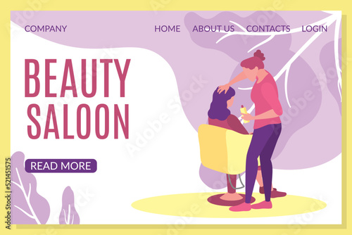 © tanjaal, Obraz premium Beauty salon landing page template. Cosmetology, haircutting and barber service concept flat vector illustration. Hairdresser making hairstyle in salon website interface.