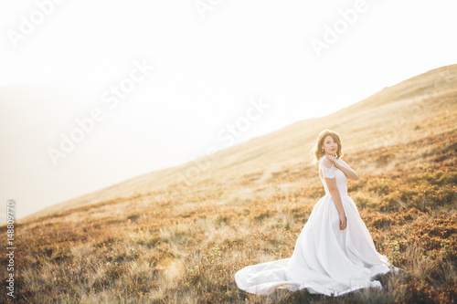 © olegparylyak, Fototapeta premium Beauty woman, bride with perfect white dress background mountains