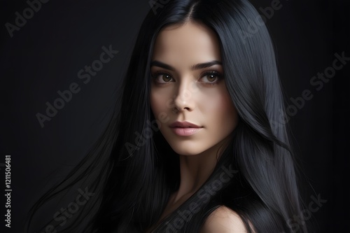 Fototapeta premium Beauty woman with straight black hair on dark background.
