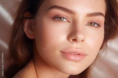 Obraz premium Beauty young woman with a healthy glowing skin is applying a skincare product