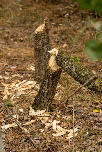 Obraz premium beaver tree damage - tree cut by beavers building a dam
