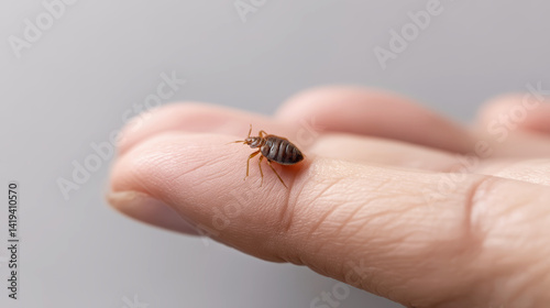 © Bonsales, Naklejka premium Bed bug crawling across human fingertip, revealing tiny parasitic insect threatening home cleanliness