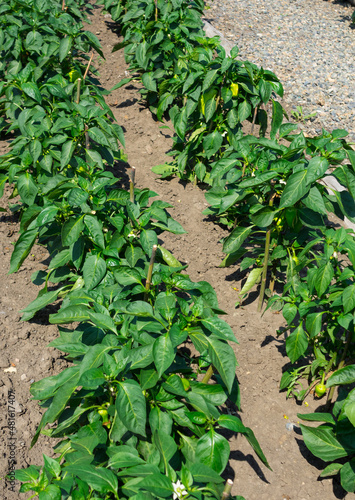 © Dmitriy Sechin, Obraz premium Bed with young bell pepper