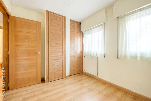 © Toyakisfoto.photos, Obraz premium Bedroom with built-in wardrobes and oak colored Venetian doors