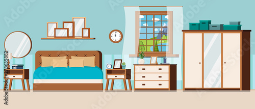 © Irina, Fototapeta premium Bedroom with window view of summer day landscape with blue lake and furniture