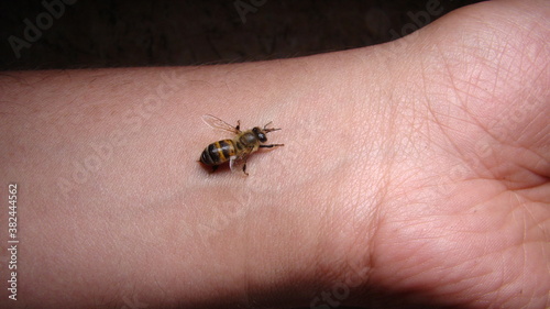 Obraz premium bee : apis mellifera treatment by honey bee sting closeup honey bee stinging a hand close up bee worker insects, insect, animal, wildlife, wild nature, forest, woods, garden beauty of pollination