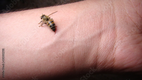 Obraz premium bee : apis mellifera treatment by honey bee sting closeup honey bee stinging a hand close up bee worker insects, insect, animal, wildlife, wild nature, forest, woods, garden beauty of pollination