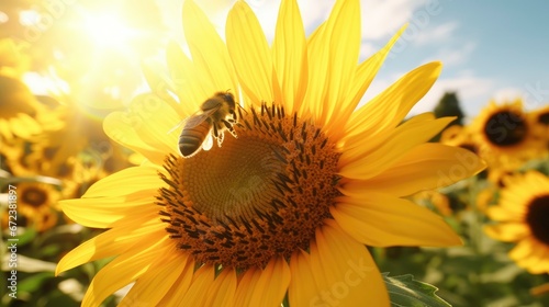 Naklejka premium Bee Collecting Honey from Yellow Flower, Macro Photography, Summer and Spring...