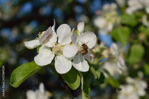 Fototapeta premium Bee collecting nectar and pollen on the apple-tree flower