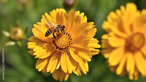 © Ulfat, Obraz premium Bee collecting pollen on yellow flower in garden
