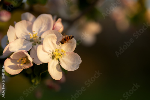 © Literat, Fototapeta premium Bee collects nectar on a white apple tree flower. Macro capture