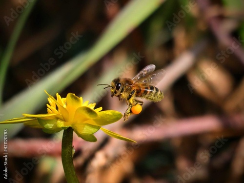 Fototapeta premium bee flying yellow flower abeilles pollen