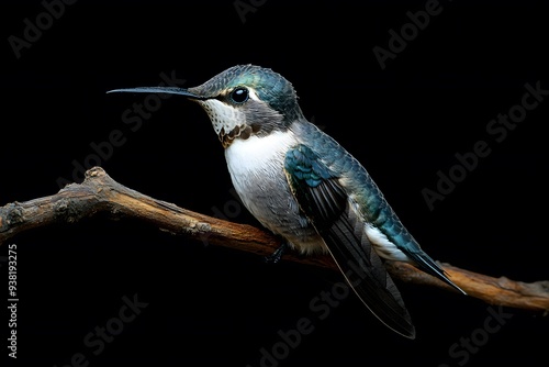 © LeoArtes, Fototapeta premium Bee Hummingbird Bird Perched on a Branch on a Black Background, Realistic Photo, Standard Background, Wallpaper, Cover and Screen for Smartphone, Cell Phone, Computer, Laptop, 9:16 and 16:9 Format