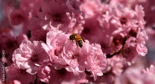 © katacarix, Fototapeta premium Bee on a pink cherry blossoms. Cherry flowers blossoming in the springtime. Pink cherry blossom in full bloom. Sakura Japanese cherry blossoms in the botanic garden.