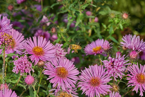 © Photo, Obraz premium Bee on a violet pink flower collects nectar in macro in fly