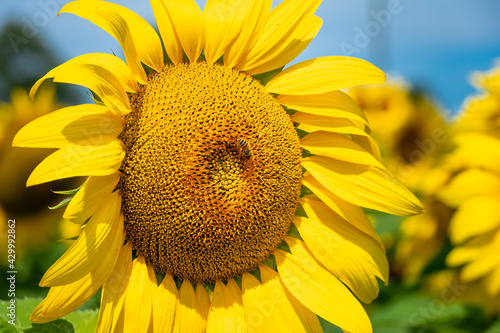 Fototapeta premium Bee on sunflowers. macro and selective focus.
