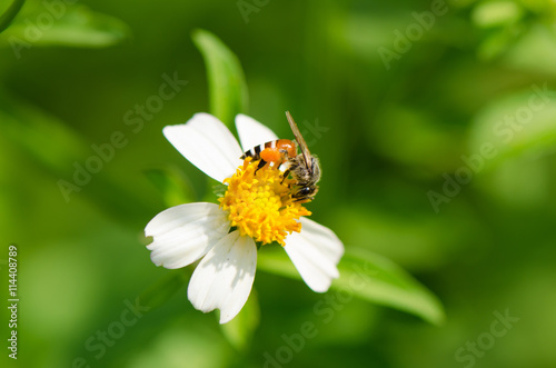 © tippapatt, Fototapeta premium Bee on wild grass flower with green background.