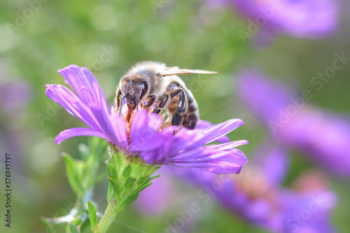 © DirkDaniel, Fototapeta premium Bee pollinates Aster dumosus