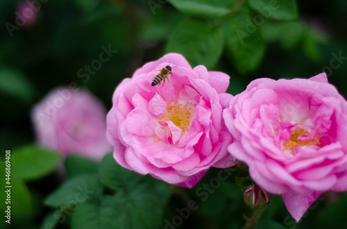 © Cavan, Obraz premium bee pollinates rose flowers, free space