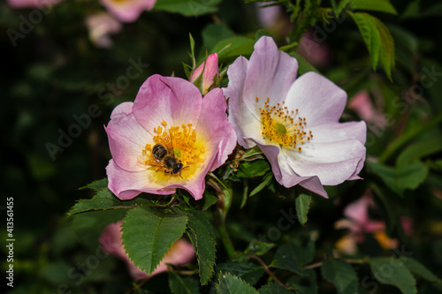 Obraz premium Bee pollinating in a Rosa Canina or dog-rose flowers in spring