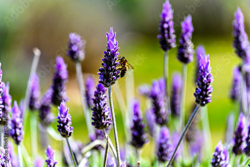 © Toni, Obraz premium Bee pollinating on lavender flower with blurred background. selective focus