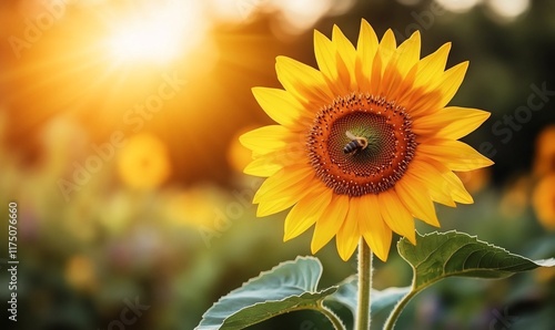 Naklejka premium Bee pollinating sunflower at sunset, field background, nature