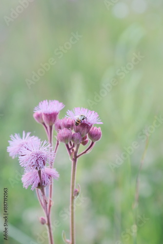 © Dylan, Fototapeta premium Bee sitting on a pink flower with a soft green background