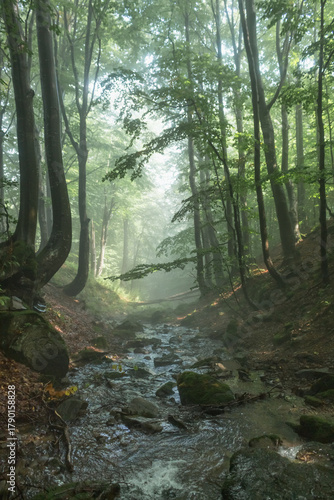 © Alla, Obraz premium Beech Forest with Mountain Stream in Morning Fog