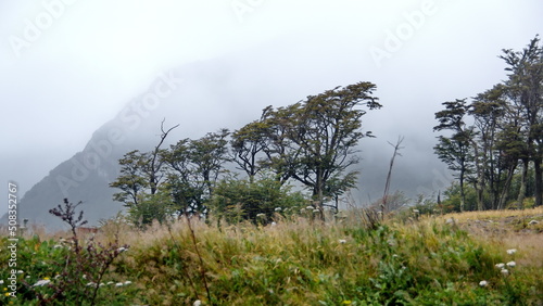 © Angela, Obraz premium Beech trees in a forest above Ushuaia, Argentina, under overcast skies