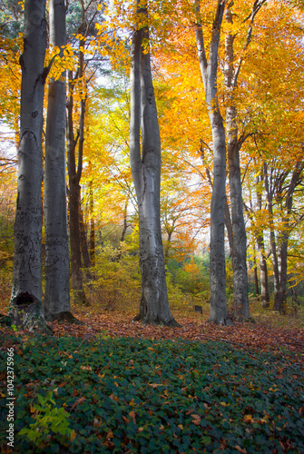 © karen, Fototapeta premium beech trees in autumn park , Vanadzor botanical garden , Armenia .