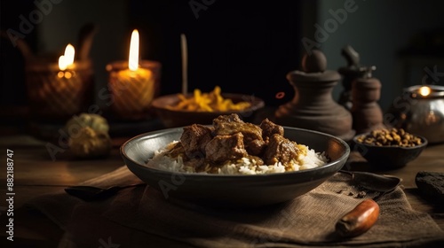 Naklejka premium Beef rendang cooked in rich coconut milk and spices served