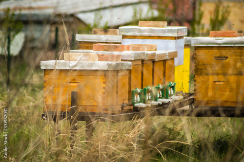 Fototapeta premium Beehives with bees in spring meadow set up