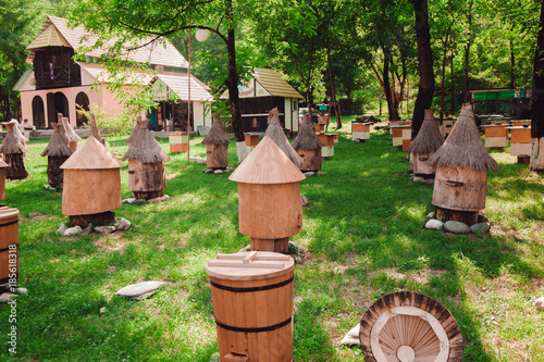 Fototapeta premium Beekeeping concept. Hives in an apiary with bees