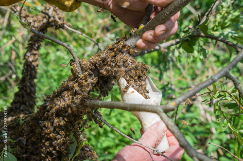 Fototapeta premium Beekeeping. Escaped bees swarm nesting on a tree.