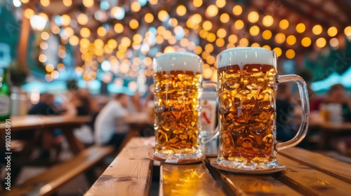 © Marco, Fototapeta premium Beer glasses on a wooden table with an open bar background. Oktoberfest concept