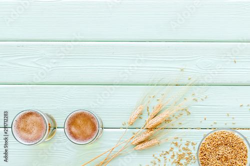 Obraz premium Beer ingredients. Barley near beer glasses on green wooden background top...
