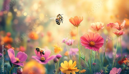 Naklejka premium Bees buzzing around vibrant flowers, actively pollinating and contributing to...