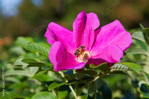 Fototapeta premium Bees collect pollen in the flowers of wild rose. Natural summer background...