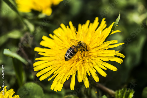 © gheturaluca, Obraz premium Bees collecting dandelion nectar