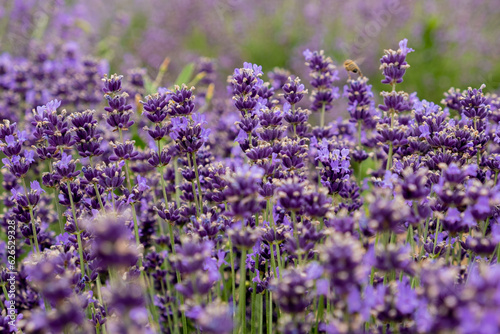 Naklejka premium Bees pollinate lavender flowers in a lavender field. Close-up. Soft focus.