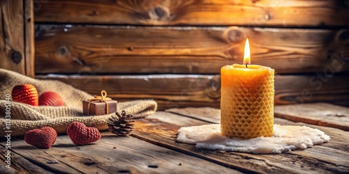Obraz premium Beeswax candle burning on rustic wooden table in cozy winter cabin, valentine dating concept, Beeswax candle, rustic