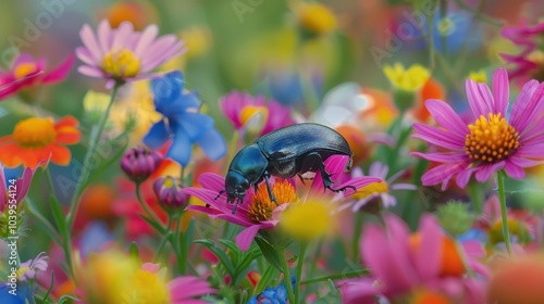 © AssanAI.Studio, Fototapeta premium Beetle Crawling Over Colorful Flowers