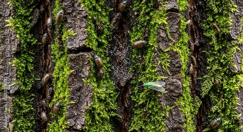 Obraz premium Beetles, ants and fly climbing a tree bark in a forest landscape