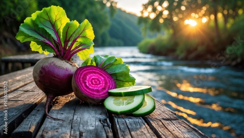 Obraz premium Beetroot and Cucumber on Wooden Pier with River at Sunset